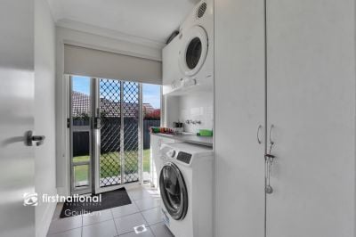 * The kitchen boasts a huge stone island bench, excellent storage, and an adjoining laundry with built-in cabinetry for added practicality.